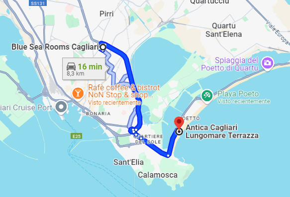 Si no disponéis de coche o no queréis cogerlo, para ir al centro está el autobús M a apenas 50 metros de la casa. Nosotros decidimos ir con el coche porque ya era un poco tarde y no nos queríamos retrasar. Por recomendación de Gian Franco fuimos a la zona de la playa Poetto, con su famoso y visitado paseo marítimo Viale Lungo Mare Poetto. Ahí mismo estaba el restaurante Antica Cagliari, también recomendación suya. Esta es su situación con respecto al apartamento.