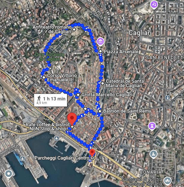 Nos levantamos y nos fuimos al centro sin desayunar, queríamos hacerlo en el corazón de Cagliari. Era domingo, con lo que no teníamos que pagar por aparcar en zona azul así que llegamos cómodamente en coche y lo dejamos por la zona del puerto, concretamente en este parking Parcheggi Cagliari Centro, Piazza Deffenu.