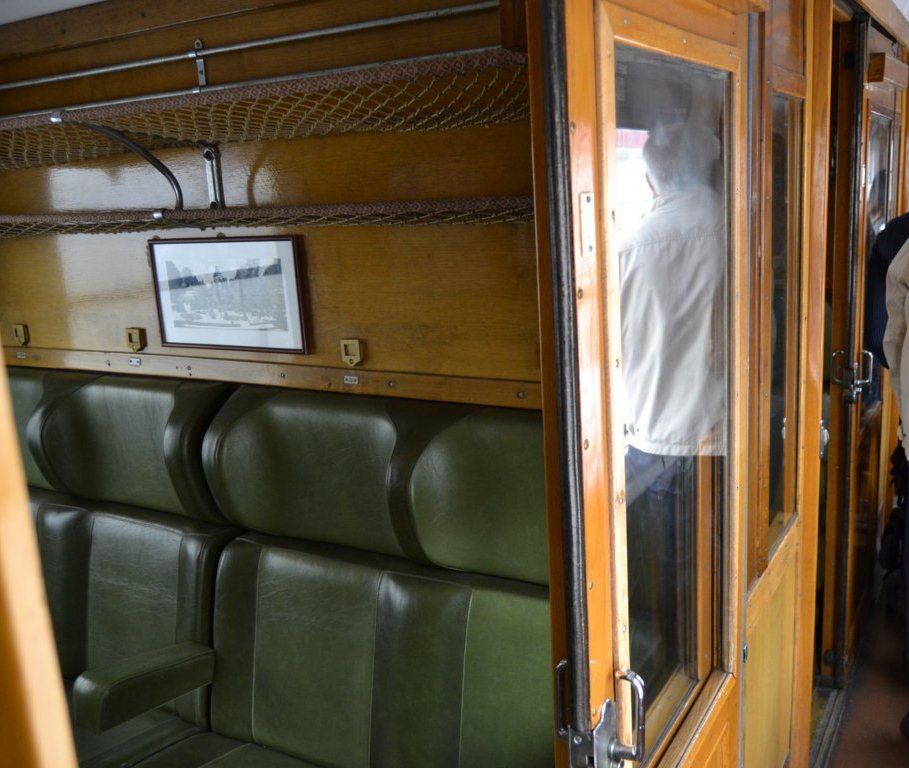 Metálico por fuera y quizás no tan atractivo a primera vista como los «Costa», lo mejor está en su interior, de estos que te retrotraen a imágenes de películas y que huelen a historia. Cuenta con un pasillo lateral al que se accede a sus ocho departamentos, de ocho asientos cada uno, que según nos dijeron en su origen eran de tapicería de tela, pero que fueron retapizados en la década de los sesenta con escay verde, también con su espacio para dejar las maletas, en fin, que conservaba todos los detalles de su época original. Aquí tenéis algunas fotos.