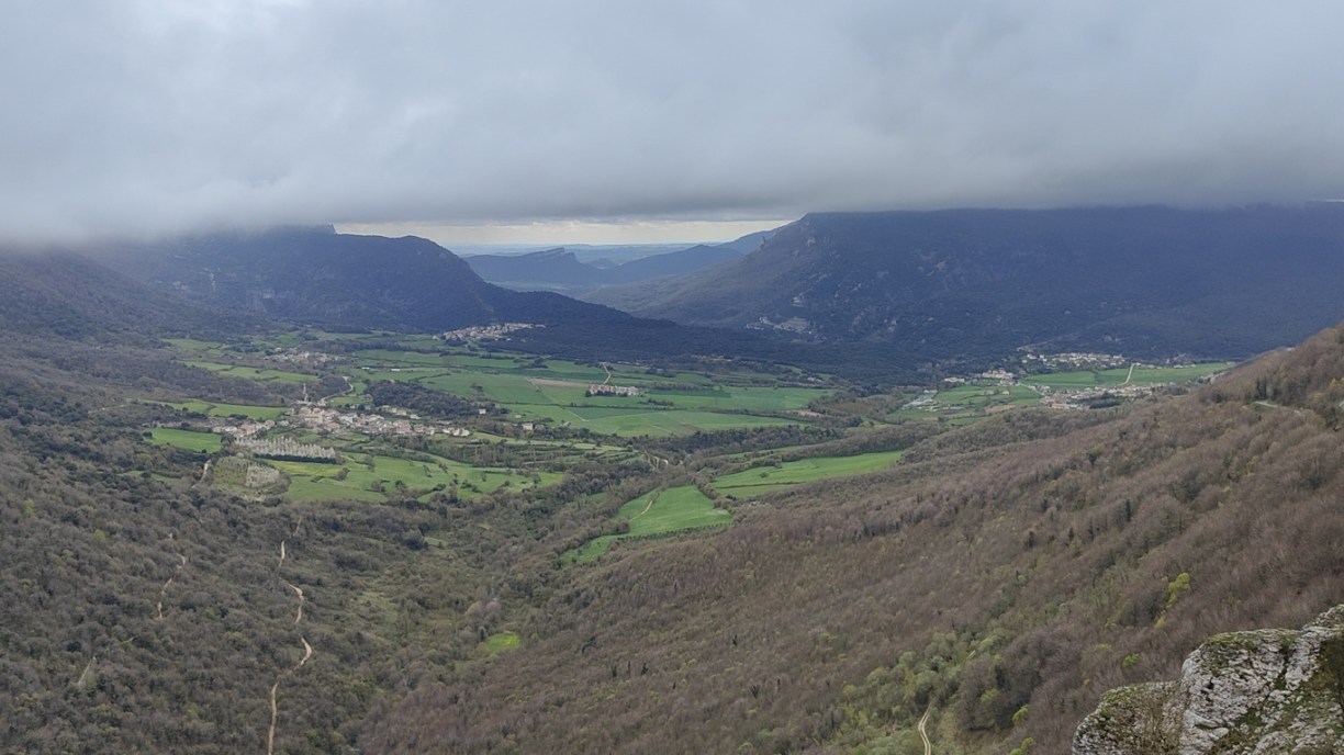Y llegaréis enseguida tras una ligera pendiente ascendente al mirador situado a 924 metros de altura que como si de un acantilado al mar se tratase, lo que veréis será el mar verde del Valle de Améscoa y más de 300 metros de caída, preciosas vistas, y eso que el día que fuimos, el tiempo no acompañaba.