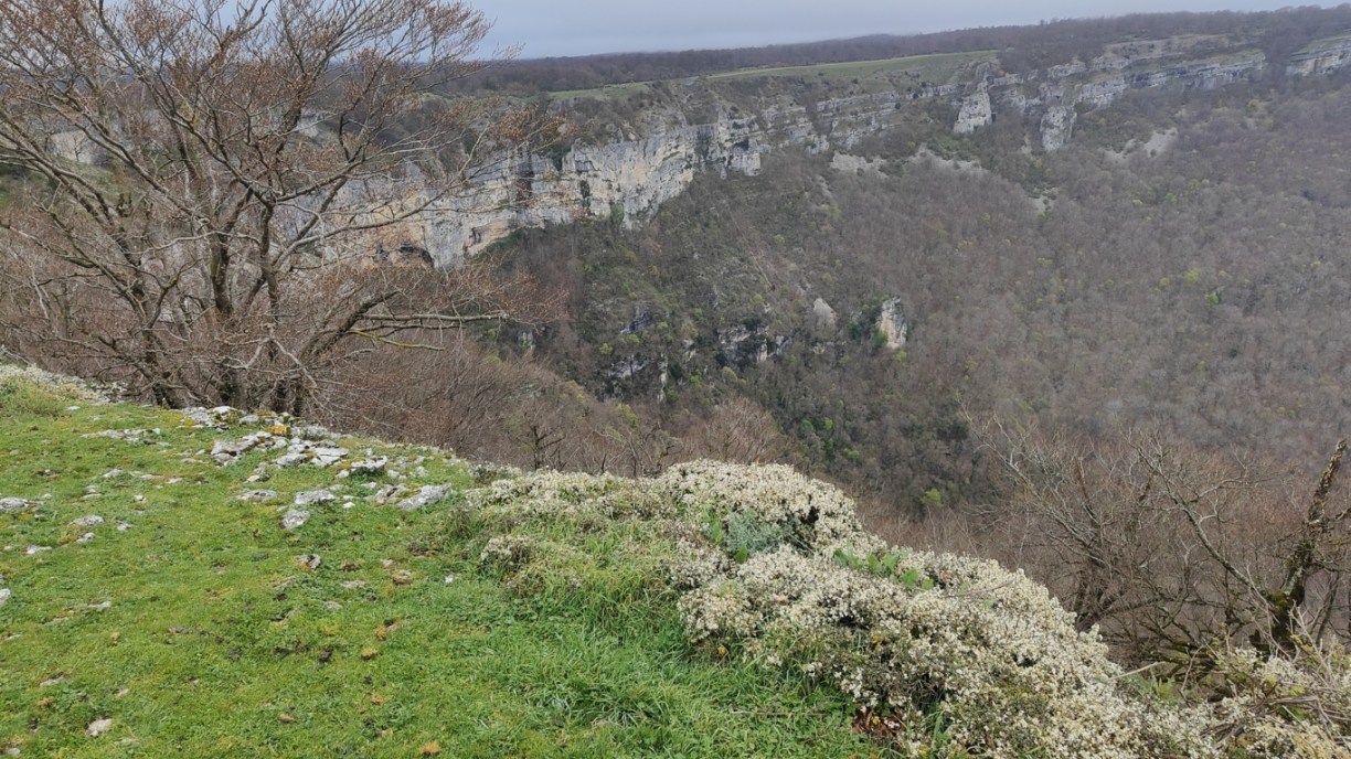 Desde aquí si os fijáis veréis la misma pared de roca que vistéis desde abajo al final de la senda, el macizo kárstico, refugio ideal para aves como el buitre leonado.