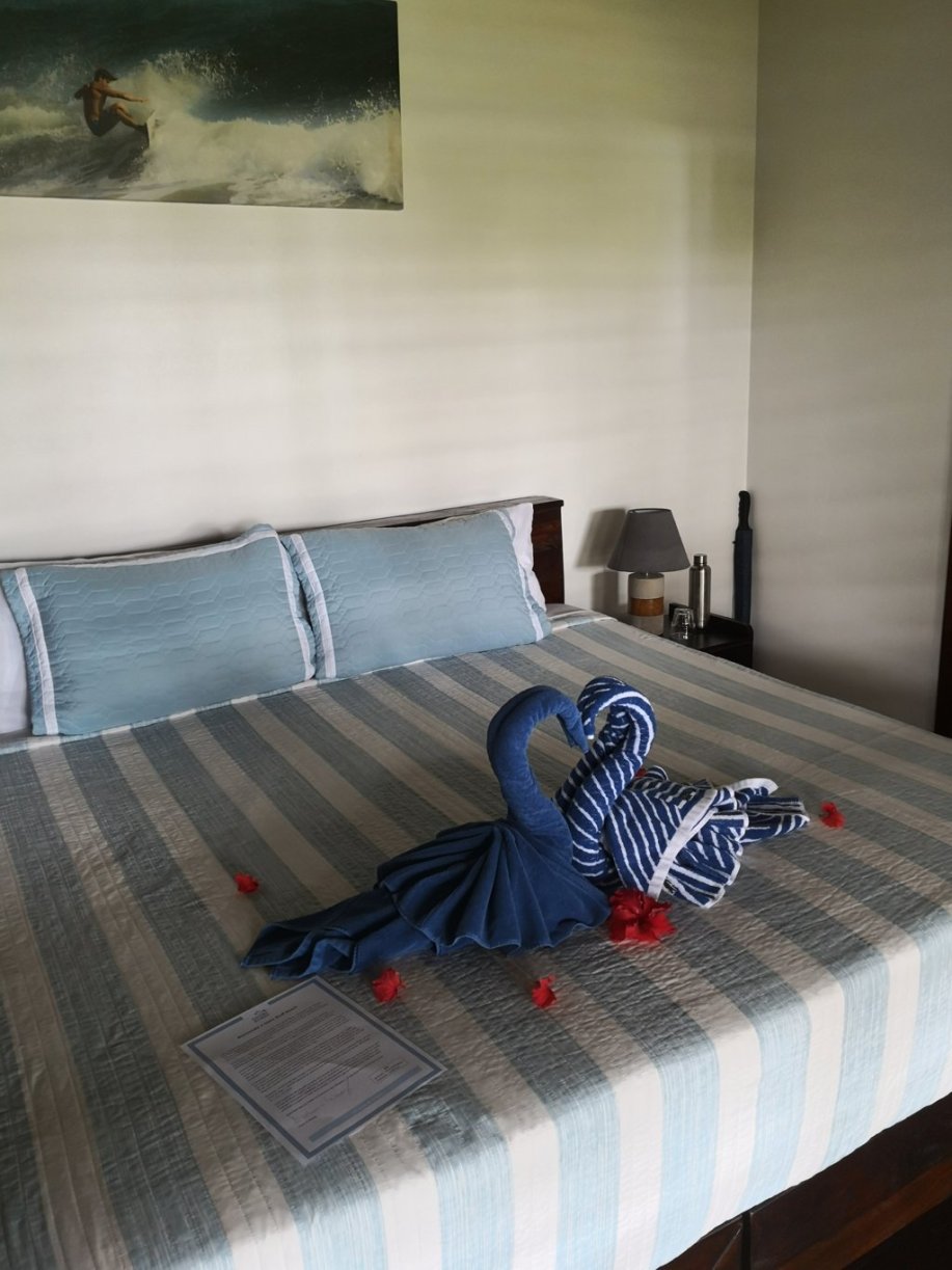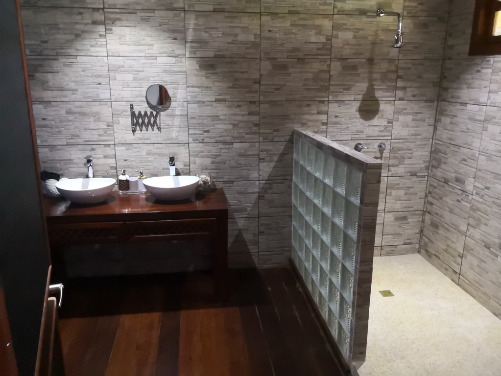 Las habitaciones están bien, sobre todo el baño, que es muy grande, con una ducha enorme, las instalaciones están bien, sin lujos, la cama inmensa, de 2x2m y las toallas de mucha calidad, disponéis de ellas para llevarlas a la playa. Atención porque tanto la puerta como las ventanas no se pueden cerrar herméticamente ya que no disponen de cristales, tienen unas amplias rendijas con mosquitera que sí que puedes voltear para tener vuestra privacidad pero no cierran del todo con lo que se oye el ruido de las olas del mar y todo tipo de animales, a mí me encantó., pero si puede haber gente a la que les puede llegar a resultar molesto si para dormir necesita silencio.