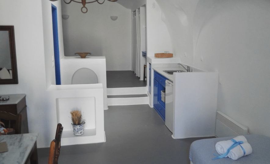 Las habitaciones excavadas en la roca nos parecieron de lo más singulares. La nuestra disponía de una cama doble al fondo del cuarto y una individual para nuestra hija, con una pequeña cocina y una mesa con sillas. Todo blanco y azul y con muchos detalles que nos encantaron.