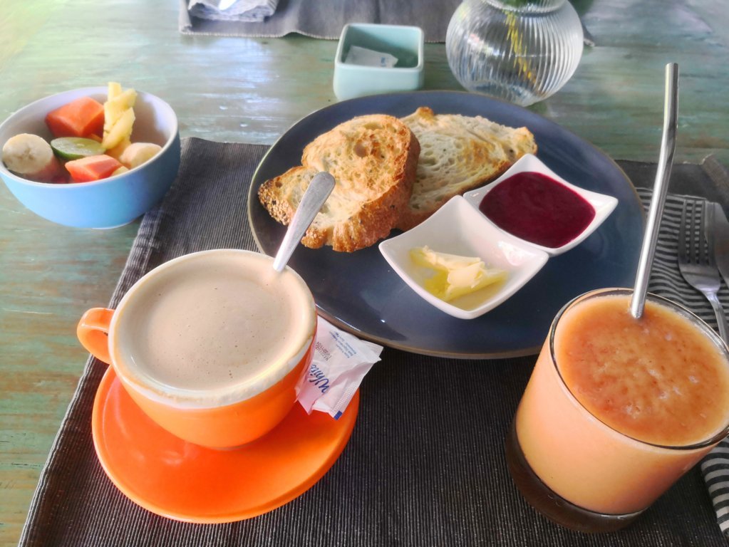 El desayuno estaba espectacular, había una carta con varias opciones pero nosotros descubrimos las tostadas de un pan estupendo, nada que envidiar al de España, con un café muy bueno y zumos de diferentes frutas que podías cambiar como quisieras. Por supuesto la fruta no podía faltar, todo buenísimo.